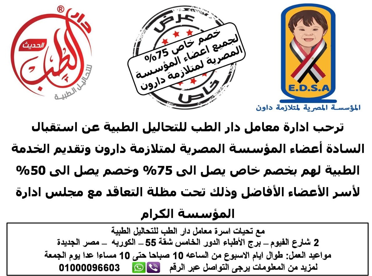 تعلن المؤسسة المصرية لمتلازمة داون للرعاية والتنمية عن بروتكول تعاون مع معمل فاملى لاب بخصومات خاصة لحاملى كارنية بنكمل بعض التابع للمؤسسة فاملى لاب ميدان الحلمية برج فودافون ت: 015088600